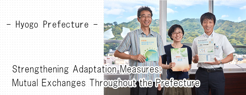 Before the national government’s adaptation plan in March 2017, the Hyogo prefectural government had developed and incorporated adaptation measures into a plan, the result of which was the Hyogo Prefecture Plan for Promotion of Measures against Global Warming. Koji Koshio, Manager of the Global Warming Measures Section; Yo Yoshimura, Assistant Manager of the Section and Promotion Group Leader; and Naoko Nakagawa, Chief Examiner of the Planning Group were interviewed about past and current actions for formulating an adaptation plan and incorporating that plan into the current plan, all of which is scheduled for implementation in 2020.