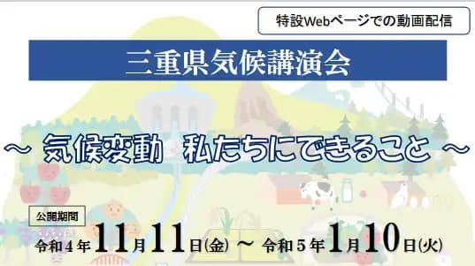 ~気候変動わたしたちにできること~をテーマに、気候変動の現状から、三重県で起きている影響や、適応策などを具体的に紹介します。