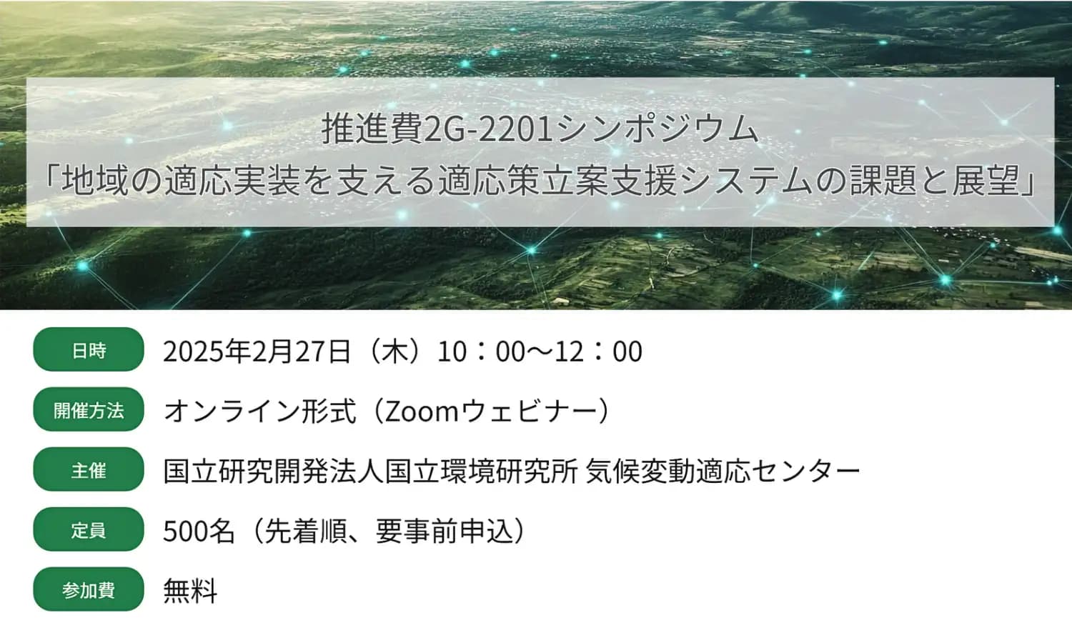 プロジェクト3年目(最終年度)となる今回のシンポジウムでは、独立行政法人 環境再生保全機構 環境研究総合推進費2G-2201「適応の効果と限界を考慮した地域別気候変動適応策立案支援システムの開発」(2022~2024年度)における研究の進捗を報告するとともに、研究成果の具体的な活用についての意見交換を行います。イベントの詳細は以下リンクボタンよりご覧ください。