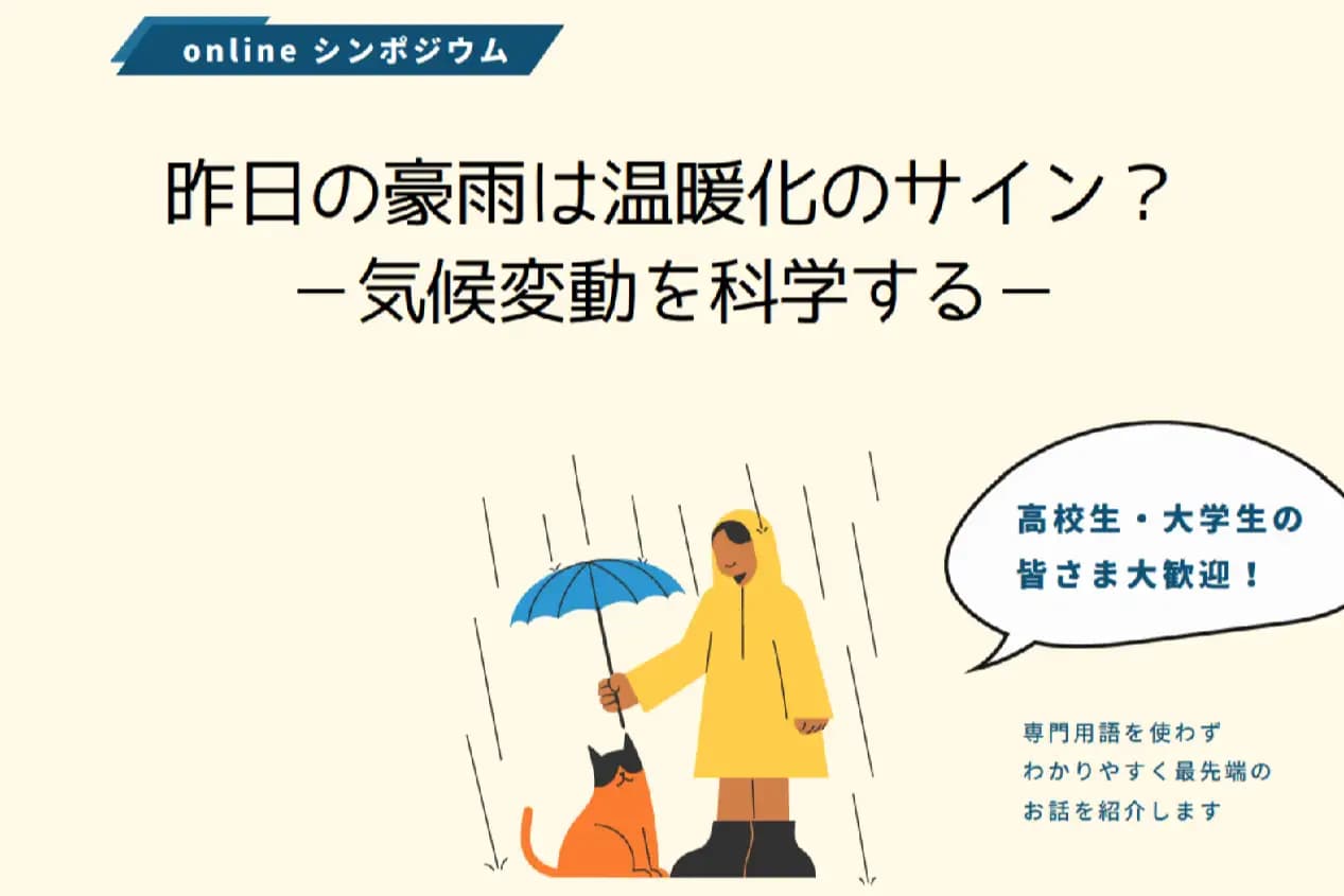 ・気候変動予測先端研究プログラム 令和6年度公開シンポジウム「昨日の豪雨は温暖化のサイン?-気候変動を科学する-」 【開催日】2024年10月20日(日)【開催地】オンライン【主催】文部科学省気候変動予測先端研究プログラム