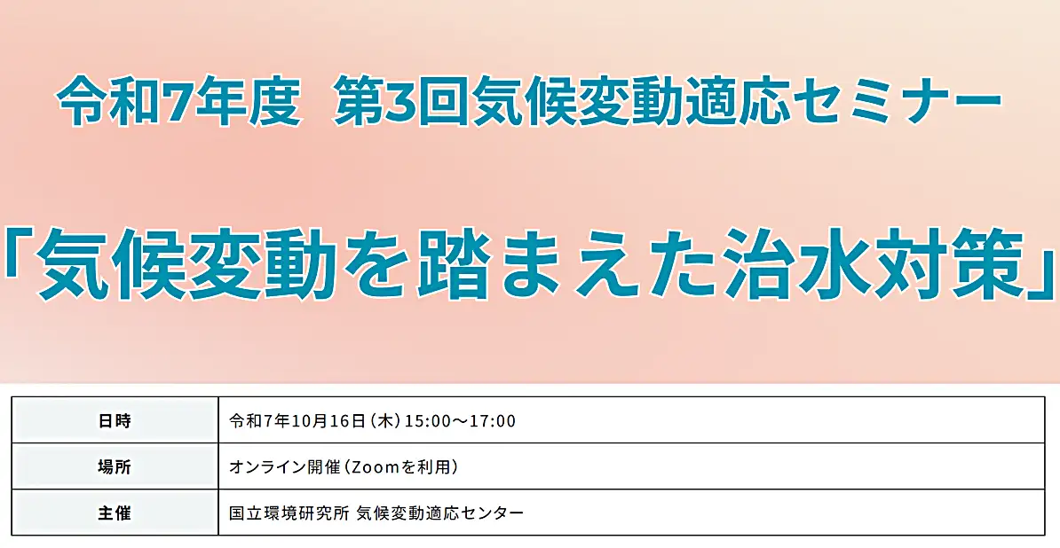 ・令和7年度 第3回気候変動適応セミナー「気候変動を踏まえた治水対策」 【開催日】2025年10月16日(木) 【開催地】オンライン【主催】国立環境研究所 気候変動適応センター