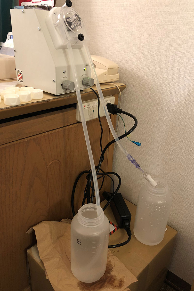 環境DNAを採取するために、送液ポンプで海水をろ過しているところ