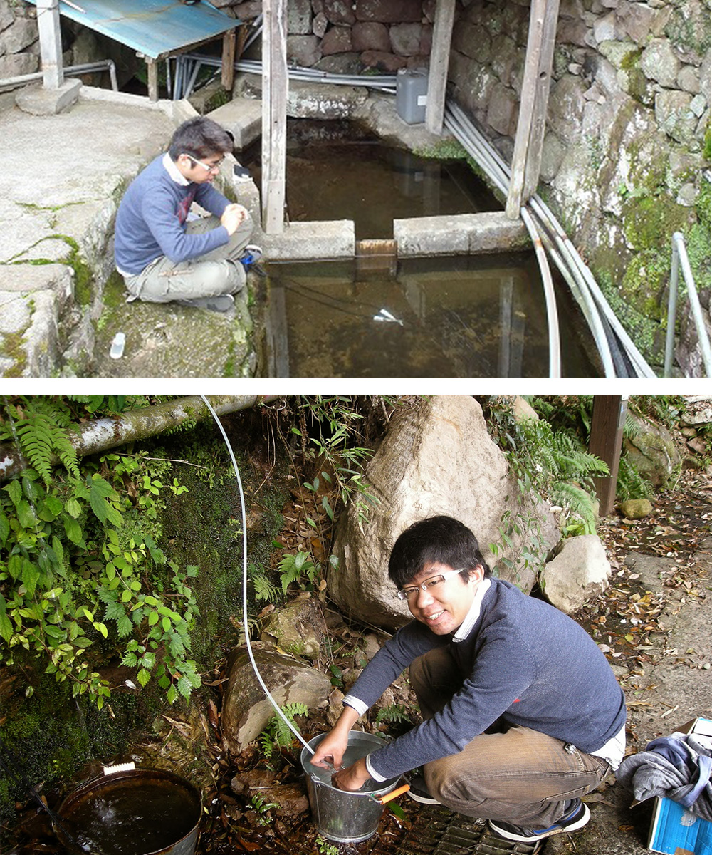 火山の噴火による堆積物は隙間が多く水を蓄えやすいため、火山体やその周辺地域では湧水が豊富に得られます。しかし、地下水がどんな地質構造の環境に蓄えられるのか、また湧水として地表に湧き出るまでの詳細なプロセスについてはまだわかっていないことも多く残されています。そこで私は、たくさんの火山が並ぶ霧島山を巡り湧き水を定期的に採取して、水の中に含まれている化学物質を解析することで、いつ降った雨に由来するのか、湧き水となって出てくるまでにどんな過程を経たのかなどについて調べていました。