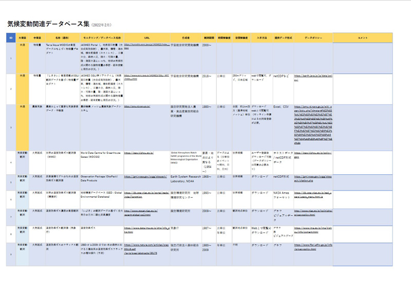 - このリストに収録するデータベースは、「長期にわたる観測」および/あるいは「多点での観測であり今後の再調査等により気候変動影響把握に役立つ観測」で得られたデータを対象としています。