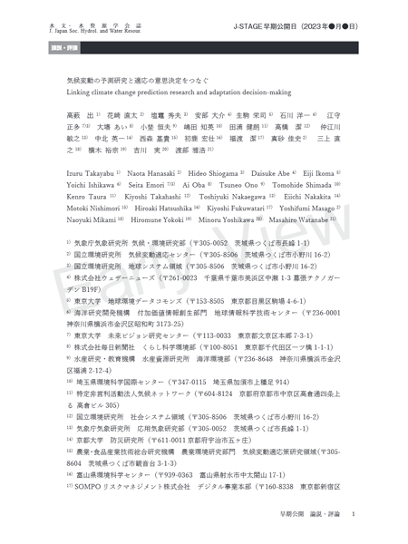 高薮出・花崎直太・塩竈秀夫・石川洋一・江守正多・嶋田知英・杉崎宏哉・高橋潔・仲江川敏之・中北英一・西森基貴・橋爪真弘・初鹿宏壮・松井哲哉・山野博哉・横木裕宗・渡部雅浩.2021. 気候変動の予測情報を利用者まで届けるには.J. Japan Soc. Hydrol. and Water Resour. 34(6):377-385.