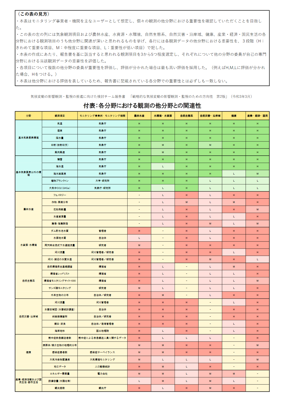 分野ごとに気候変動による影響の因果関係が一目で分かるストラクチャー図、重要な観測項目の優先度と課題をまとめた表が付いています。