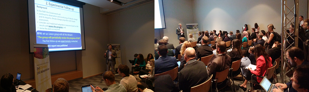 今回のセッションでは、世界の適応分野のリーダーがそれぞれ主題に沿って発表を行いました。日本からは、気候変動の影響への適応計画のフォローアップ報告書をとりあげ、指標を用いた進捗管理について紹介しました。立ち見や床に座る聴衆も見受けられるほどの大盛況で、内容への関心の高さがうかがえました。