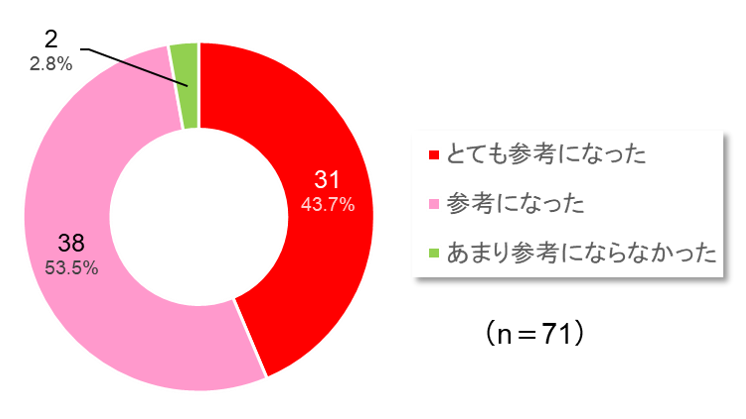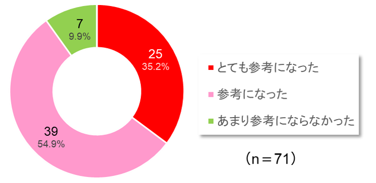 「とても参考になった」「参考になった」という回答が9割を超えました。また、改善点として「環境以外の他部局の参加」、「参考情報の充実」に関する要望をいただきました。