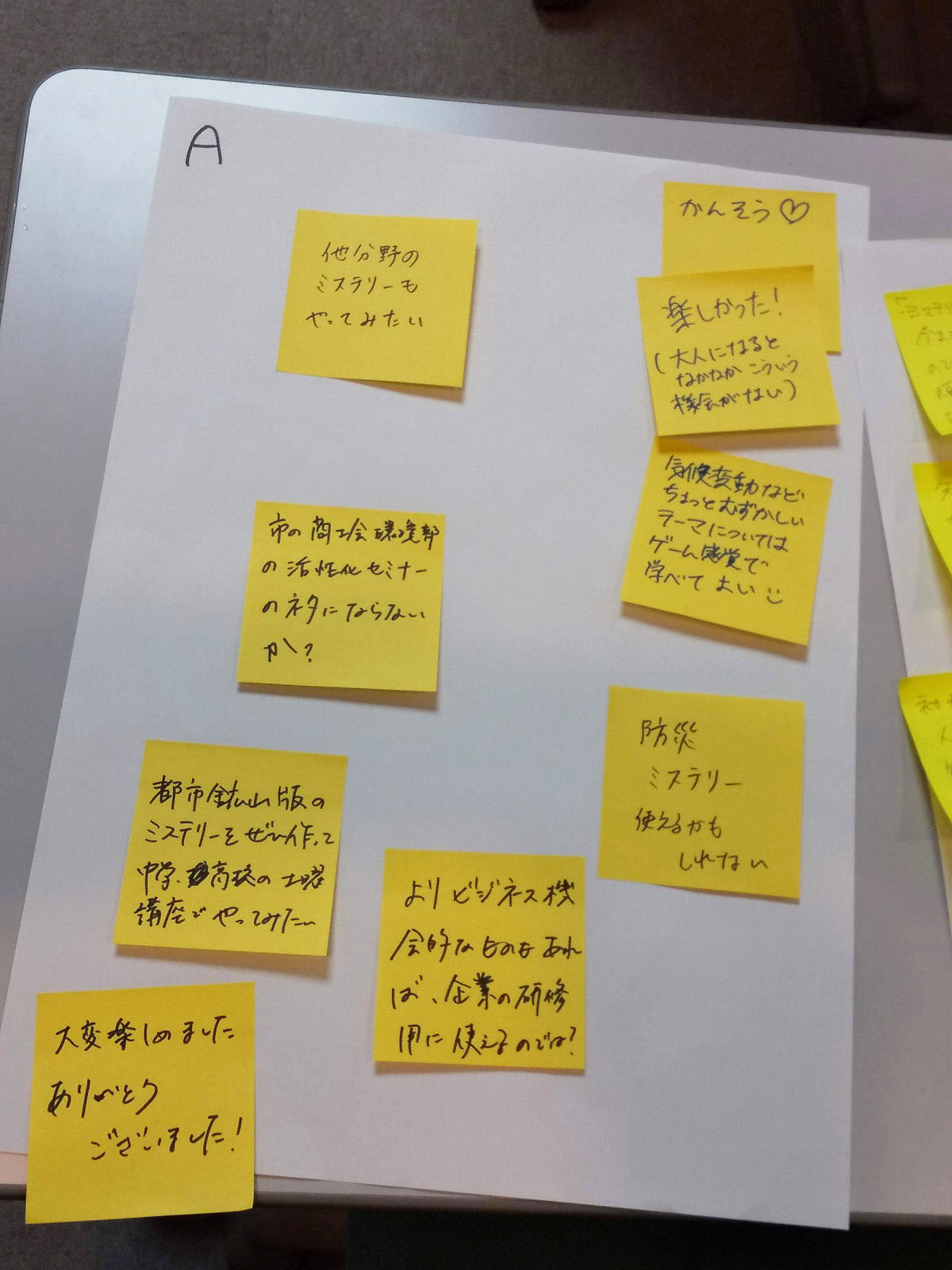 体験して楽しかったとの感想や、ミステリーで使用するカード内容、矢印マークの改善提案、SDGs、防災、ビジネスなどの機会での活用提案など、今後の展開にも大いに期待を寄せていただきました。