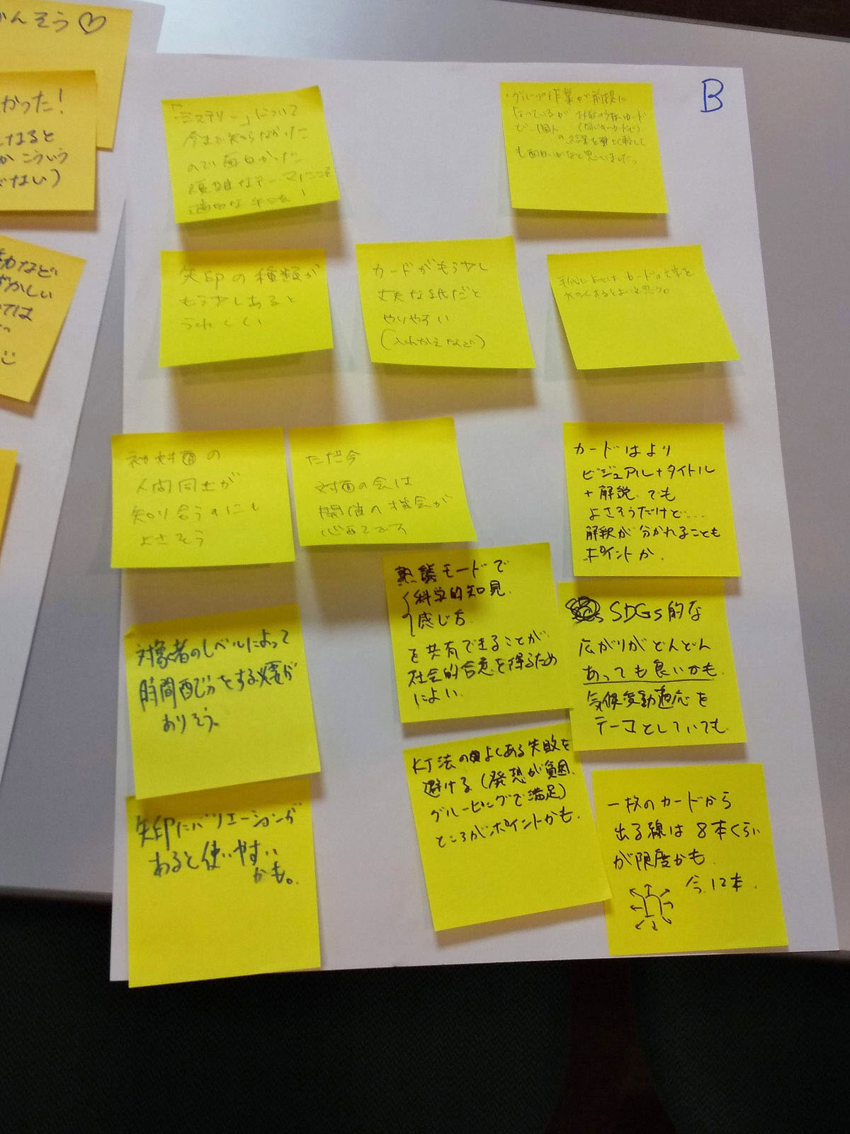 その後は、参加者の皆さんやスタッフの間で自由に感想や改善提案、今後活用できそうな機会等について意見共有いただく時間を設け、その内容を付箋に記入していただきました。