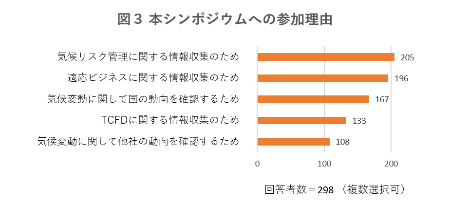 本シンポジウムへの参加理由として、半数以上の回答者が「気候リスク管理に関する情報収集のため」「適応ビジネスに関する情報収集のため」「気候変動に関して国の動向を確認するため」を選択しています。
