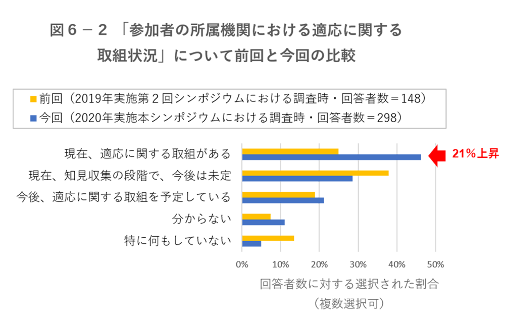 「参加者の所属機関における適応に関する取組状況」について、前回(2019年実施第2回シンポジウムにおける調査時)と今回(2020年実施本シンポジウムにおける調査時)を比較することを目的に、図6-2は各アンケートの回答者数に対する選択された割合を示しています。「現在、適応に関する取組がある」の回答数は、前回では25%だったのに対して、今回では46%で、21%上昇しました。参加者が異なるため直接比較出来ませんが、事業者による適応の取組が増えている、あるいは、適応の取組を認識する事業者が増えている可能性が示唆されました。