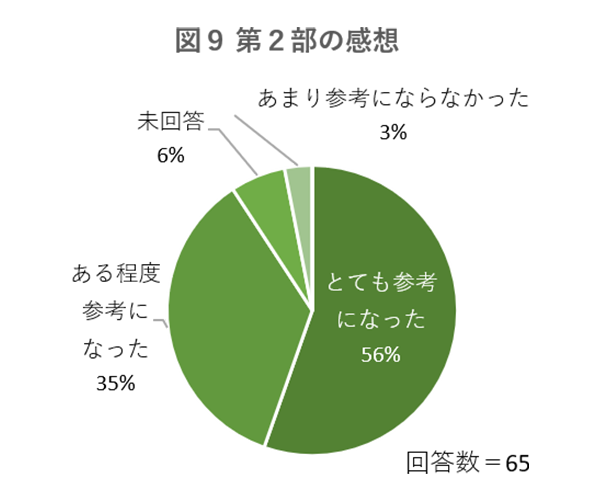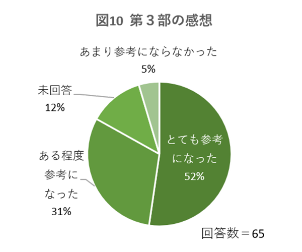 また、プログラムの第2部について、91%の参加者が「参考になった」と回答しています。さらに、第3部については、83%の参加者が「参考になった」と回答しています。