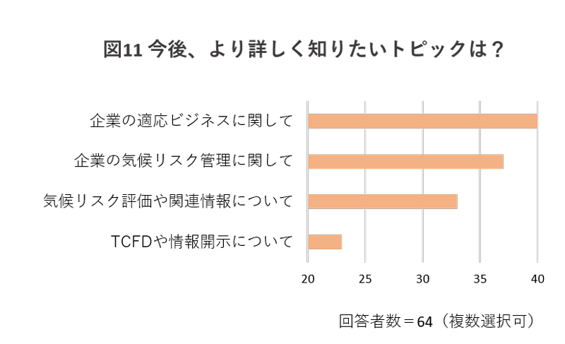 今後より詳しく知りたいトピックとして「企業の適応ビジネス」が最も多く、次いで「企業の気候リスク管理」が選択されています。