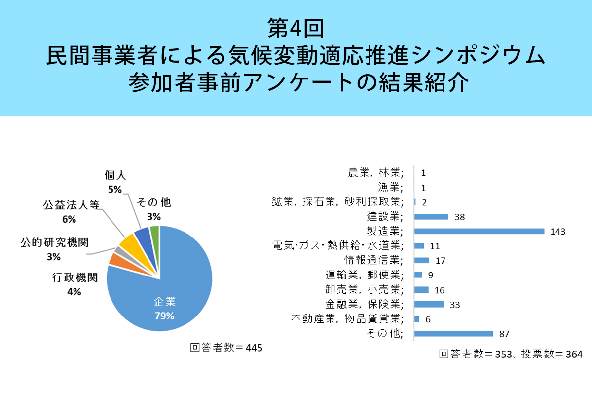 CCCA「第4回民間事業者による気候変動適応推進シンポジウム - TCFDにおける物理的リスクへの取組に向けて -」の事前アンケートの集計結果を掲載しました。