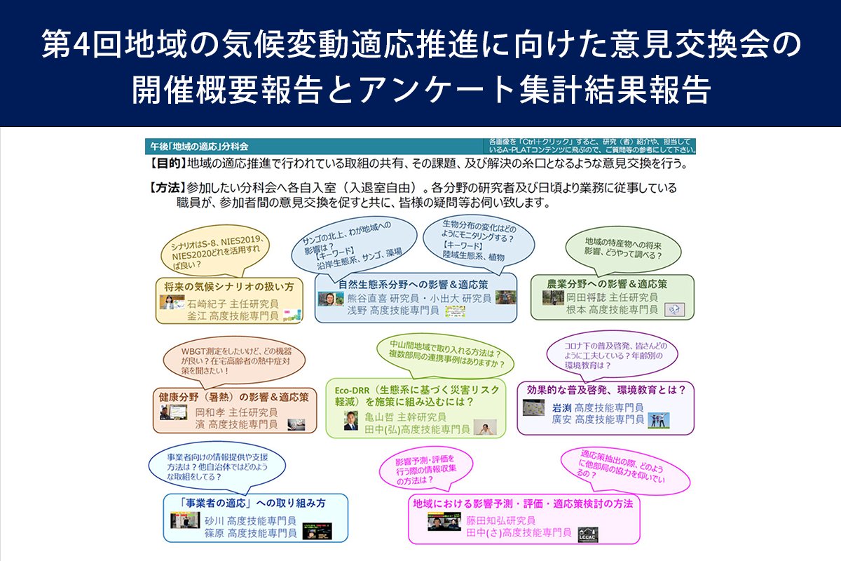 CCCA「第4回地域の気候変動適応推進に向けた意見交換会」の開催概要報告とアンケート集計結果について掲載しました。