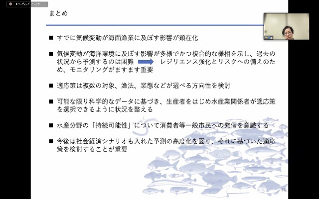 【講義1】では、水産研究・教育機構の中田 薫理事から、日本周辺の海水温上昇とそれに伴う魚類への影響(分布の変化等)についてご説明いただき、水産業分野の適応策の考え方についてわかりやすくご講義いただきました。