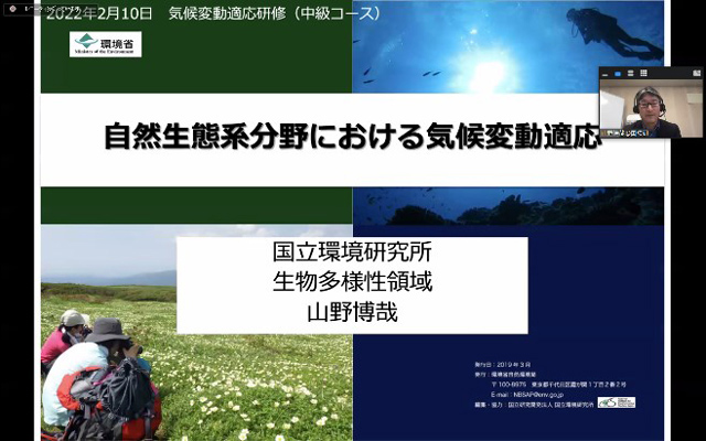 【講義2】では、国立環境研究所生物多様性領域の山野 博哉領域長から、自然生態系分野における気候変動適応の基本的な考え方の説明があり、実践への道筋として既存の取り組みの活用や部局連携の仕掛けなど、適応策推進のヒントとなる講義が展開されました。
