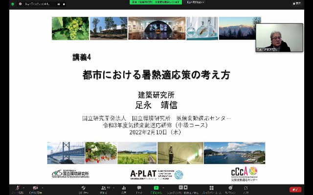 【講義4】では、建築研究所の足永 靖信研究専門役から、都市の暑熱化についてご説明いただき、自治体の役割として暑熱対策を講じた都市開発への誘導や木造密集地区など地域特性を踏まえた熱中症対策についてご講義いただきました。