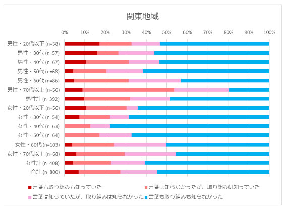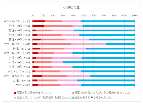 地域別の回答結果では、熱中症対策やハザードマップの利用では「九州・沖縄」、地元の農産・水産物の購入では、「北海道」「東北」、「九州・沖縄」が高く、家の断熱では「北海道」、「東北」、「中部」の地域で高いなどの特色がある結果となっています。