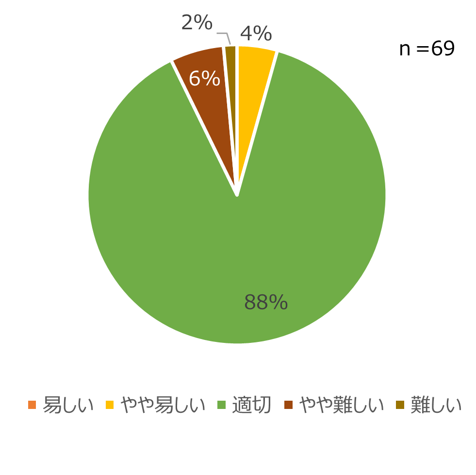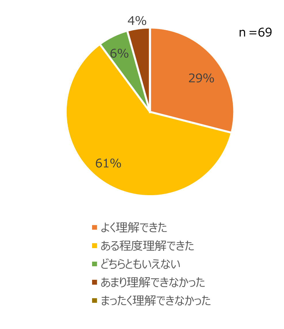 アンケートでは研修全体を通しての満足度をお聞きしましたが、「たいへん満足」「満足」との回答が合わせて83%、「どちらかと言えば満足」との回答が17%と、おおむね高い評価をいただきました。一方、今回の研修の課題や改善点ついても具体的なご指摘をいただきました。