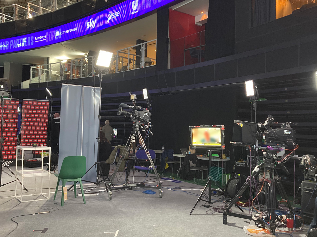 SECには円形の天井の高い会場があり、そこの中央部には天井から吊るされた美しい青い地球が光っていました。ここにはテレビ局のスタジオがそのまま飛び出してきたような場所もあり、大きなカメラでインタービューなども行われていました。