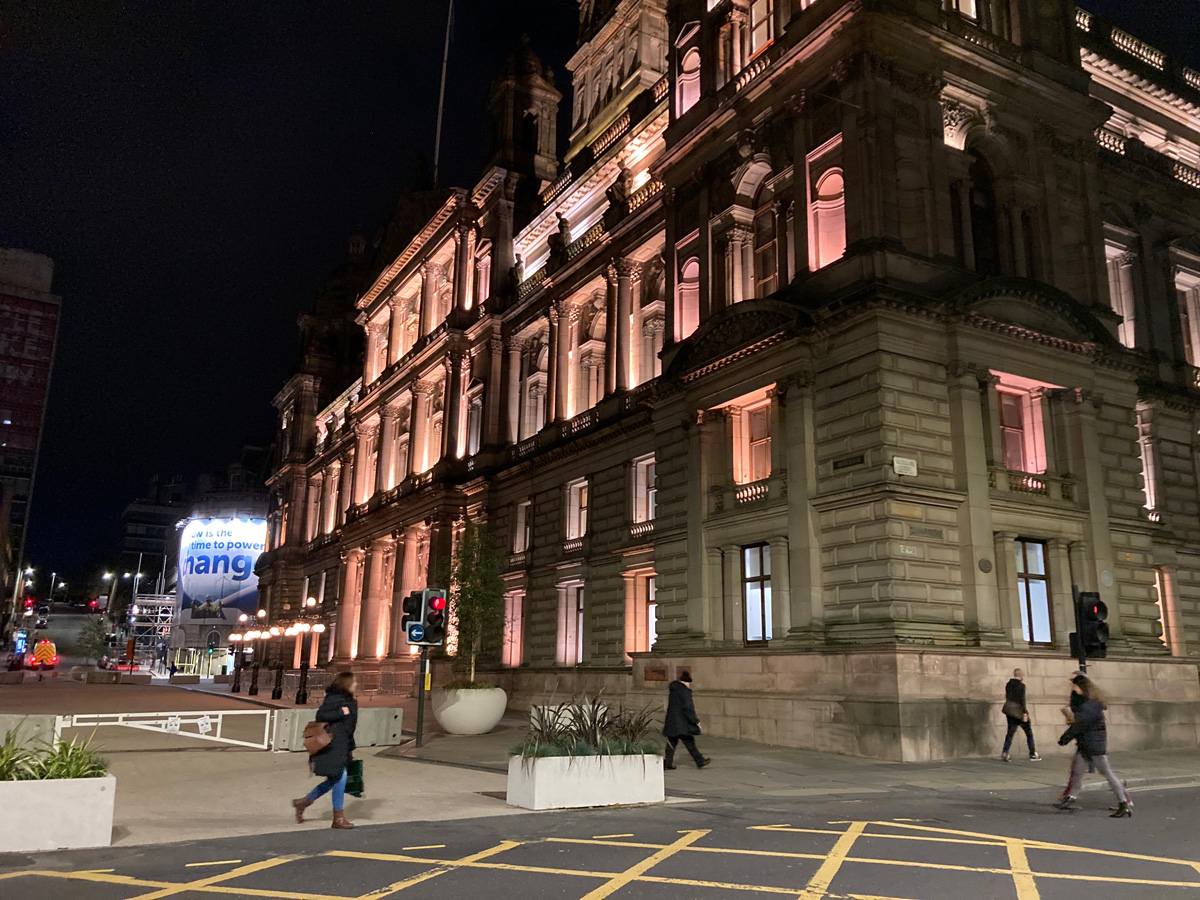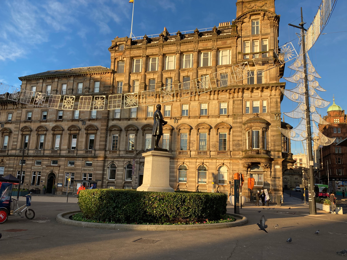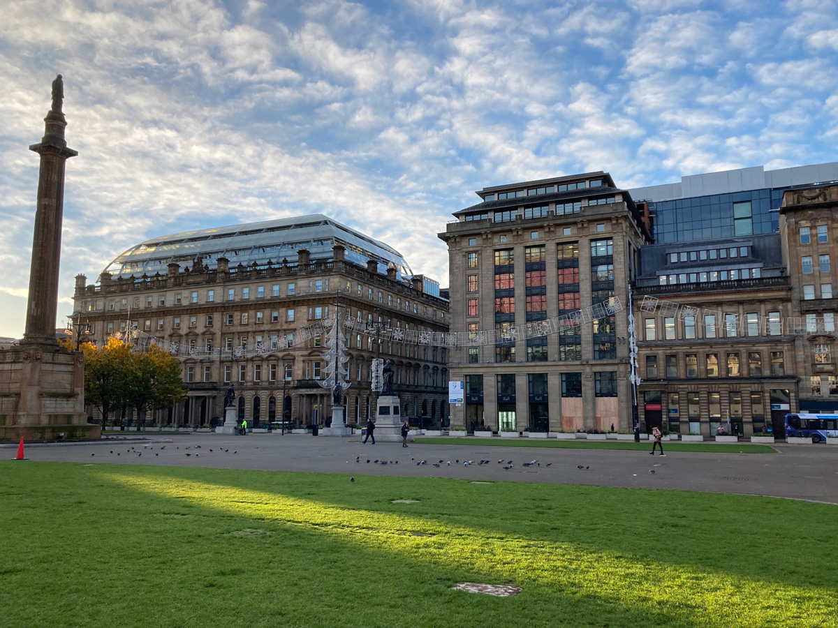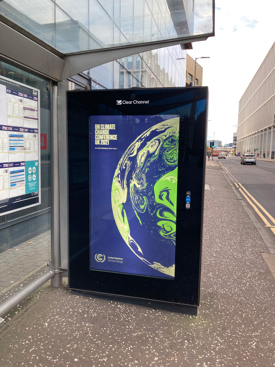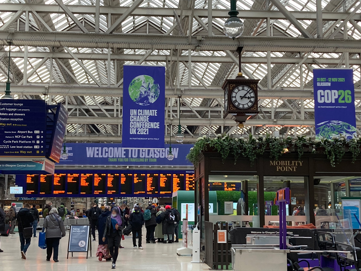 グラスゴーの街自体がCOP一色という感じでした。下の写真はグラスゴー中央駅。COP26のフラッグや垂れ幕がたくさん掲げられています。バス停も写真のような感じです。