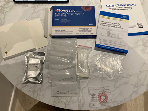 会場に入る際、コロナの簡易テスト結果を示さなければいけません。下の写真は、COP参加者に配布されたコロナ簡易テストキットです。無料で配布されます。毎朝、テストを行い、5分ぐらいで結果がでます。それをインターネットに記入し、その後、メールで結果を受け取り、それを会場に入る際に見せるという段取りです。簡易テストではありますが、毎日自分が陰性であることを確認でき、少なからず心の安心を得て会議に臨むことができました。