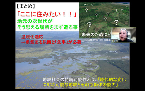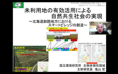 【講義1】では、国立環境研究所生物多様性領域の亀山 哲主幹研究員から、未利用農地の空間分布と定量化、土地利用デザイン支援システムについて説明があり、将来シナリオ(2050年)に基づく自然共生地域創り「スマートビレッジ」に関してご提言いただきました。