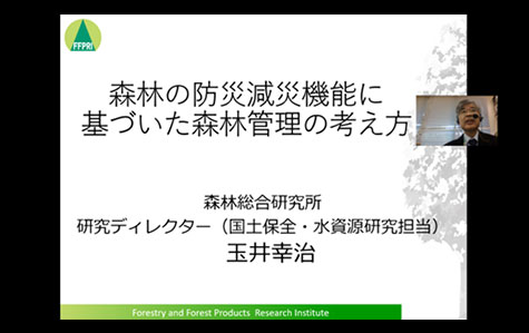 【講義2】では、森林総合研究所の玉井 幸治研究ディレクターから、森林の洪水緩和機能について観測データを基にご説明いただき、森林の防災減災機能に基づいた森林管理の考え方から、森林の伐採植栽における留意点をわかりやすくご講義いただきました。