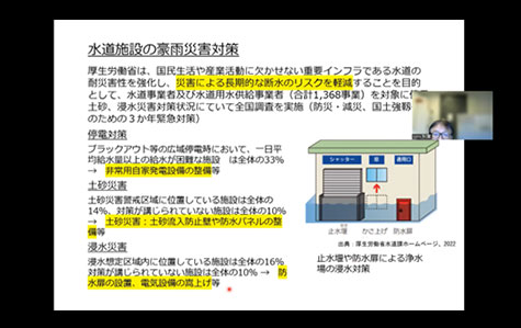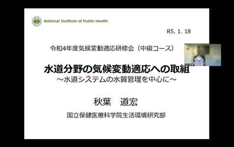 【講義3】では、国立保健医療科学院の秋葉 道宏特任研究官から水道分野の気候変動適応への取組についてご説明いただきました。水道事業の定義から、気候変動の影響や今後の水道事業の方向性など幅広い内容をわかりやすくご説明いただきました。