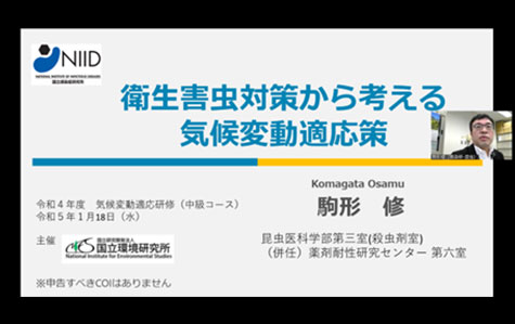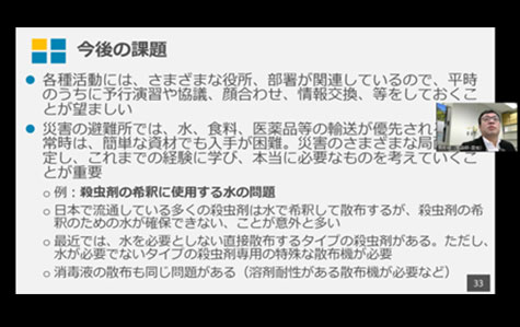 【講義4】では、国立感染症研究所の駒形 修主任研究官から衛生害虫対策から考える気候変動適応策についてご説明いただきました。デング熱を媒介するヒトスジシマカの分布域拡大の状況や、非常時の備えとして媒介蚊の駆除訓練の紹介や避難所でのハエ対策等で必要なことをご紹介いただきました。