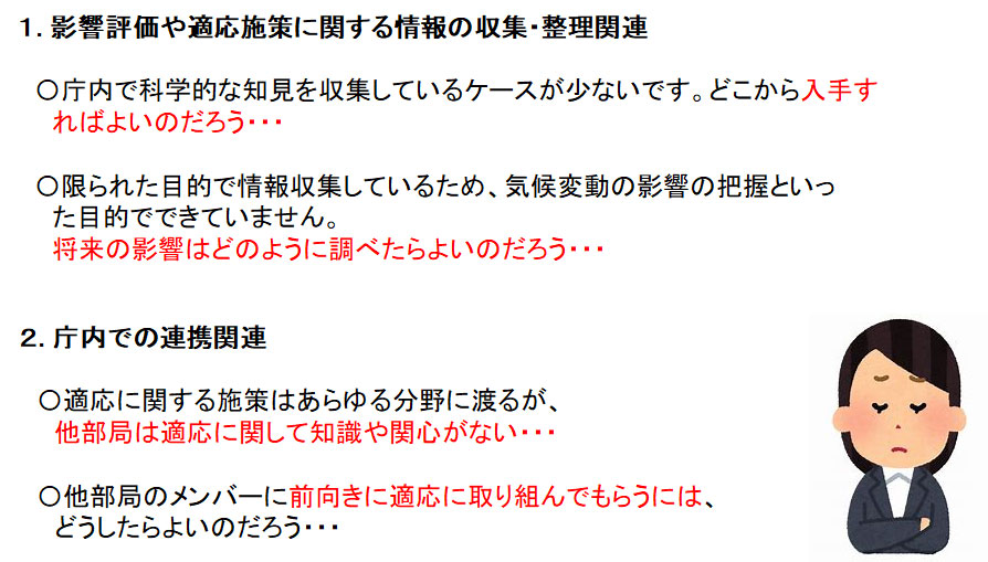 - ゼロ・カーボン達成に向けた諸々の調査や業務が忙しく、適応計画策定には手が回りません。組織内に専門知識を有する人材が乏しいため、対応が難しいです。