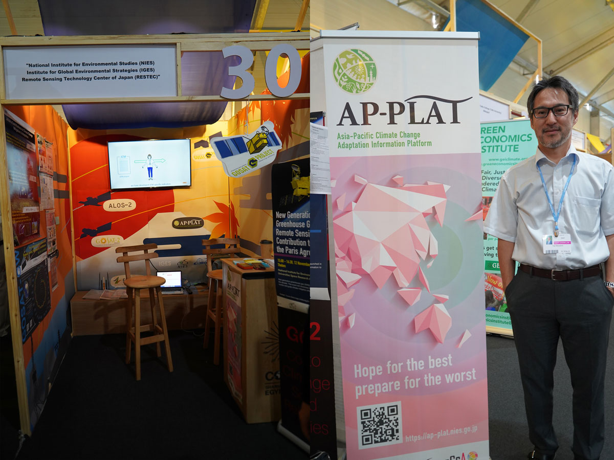 気候変動適応センターからは、アジア太平洋気候変動適応研究室のメンバーが参加しました。同じ国立環境研究所の衛星観測センターと社会システム領域に加えて、RESTEC、IGESなどの各研究機関と共同開催したWEEK1の展示では、日本の研究機関における緩和と適応のための技術や研究などを紹介しました。展示期間中に、気候変動に関する技術に関心を持つ方達が展示ブースを訪れてくれました。