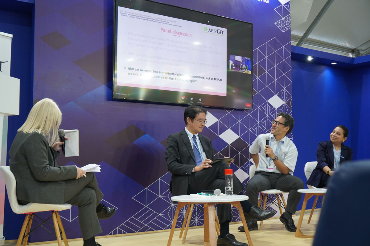 また、11月11日(金)にJAPANパビリオンで行われたセミナーでは、国家適応計画(NAP)を効果的に策定・実施するために、アジア太平洋地域の国々のNAP策定の経験が共有されました。日本、バングラディッシュ、東ティモールなど国際色豊かなメンバーで、NAP策定・実施にあたっての課題や、アジア太平洋気候変動適応情報プラットフォーム(AP-PLAT)に始まる日本の知見や技術がどのように適応計画の推進に貢献できるのかという事柄についてディスカッションが行われました。