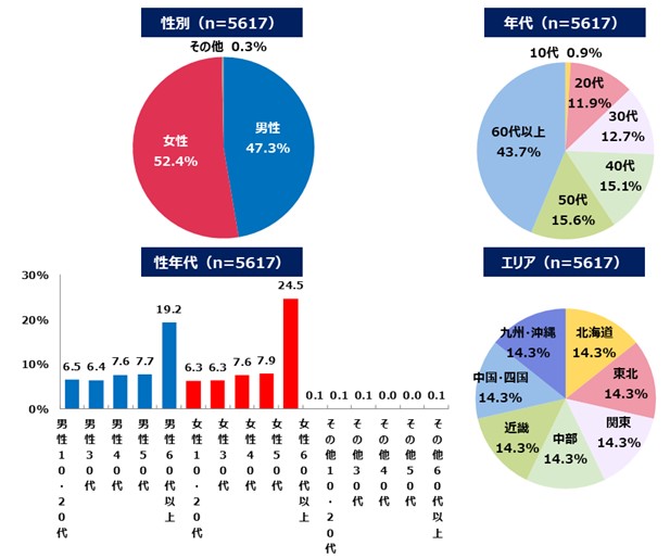 - 居住地:全国7地域(北海道地域、東北地域、関東地域、中部地域、近畿地域、中国四国地域、九州・沖縄地域)