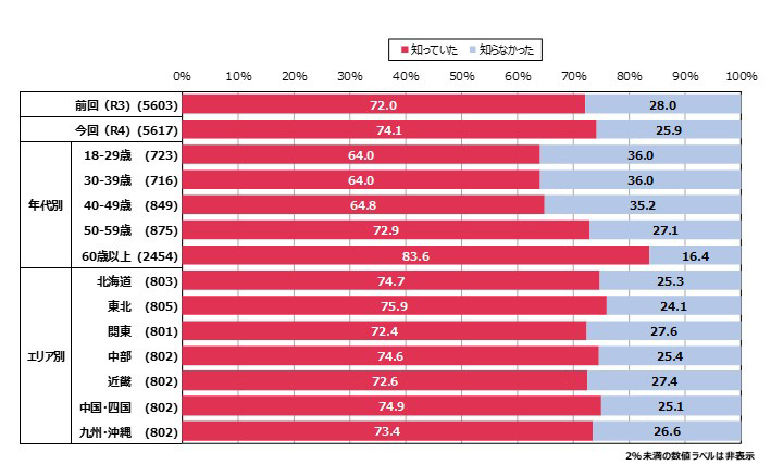 気候変動の影響について「知っていた」とする回答は、今回調査では全体結果で74.1%(昨年度72.0%)となりました。令和3年度調査からの増加は2.1ポイント(有意水準5%で有意差あり)となっています。年代で比較をすると、「60歳以上」が最も認知度が高く83.6%、次いで「50-59歳」が72.9%と平均より高い結果となりました。また、地域ごとに大きな差はありませんでした。