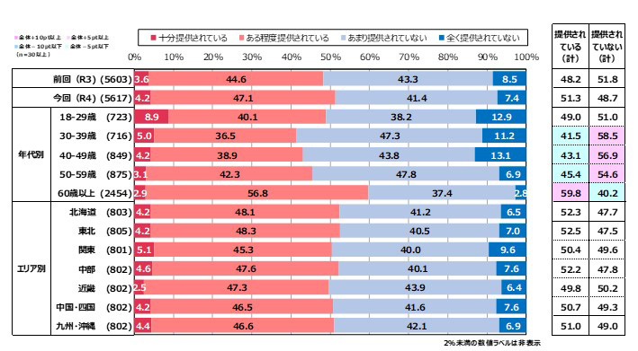 「十分提供されている」及び「ある程度提供されている」の合計を年代別で比較すると、「60歳以上」が59.8%と高く、次いで「18-29歳」が49.0%となりました。地域では大きな差はありませんでした。