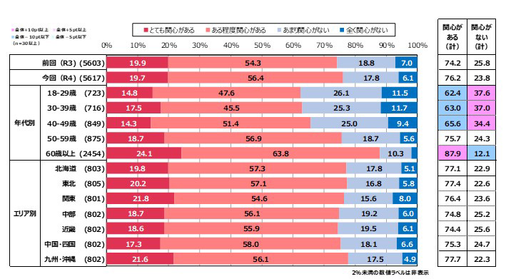 気候変動影響への関心については「とても関心がある」19.7%、「関心がある」56.4%と計76.2%が気候変動の影響に関心があると回答しており、令和3年度より2ポイント(有意水準5%で有意差あり)増加する結果となりました。