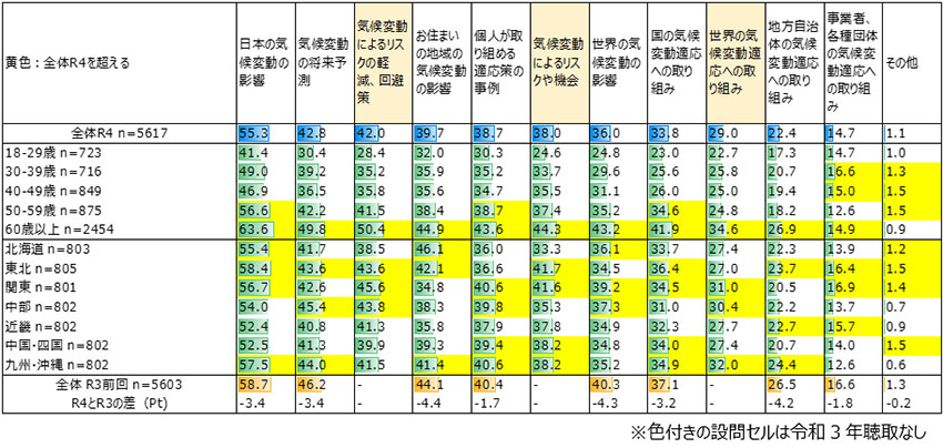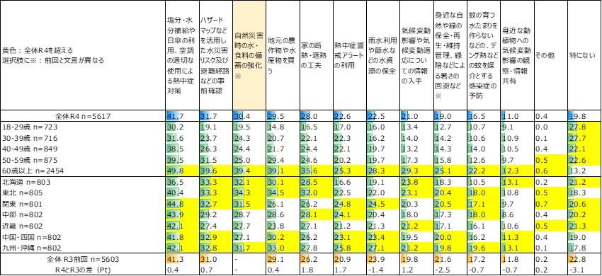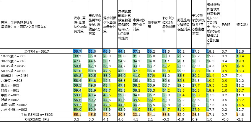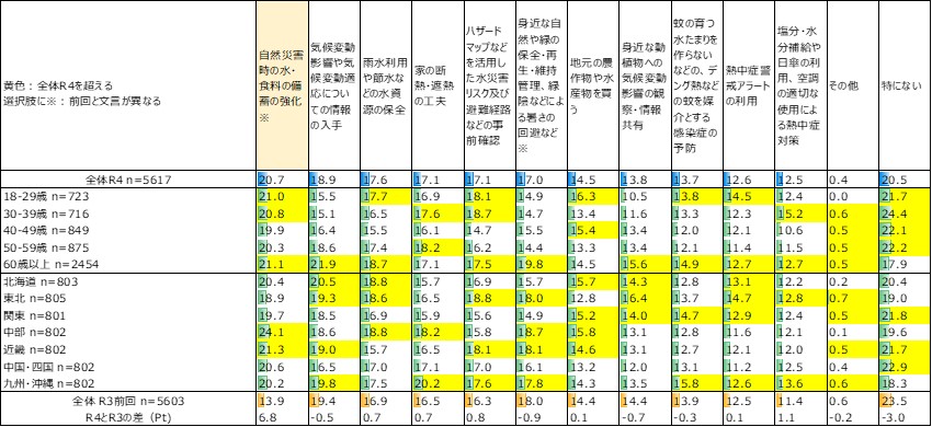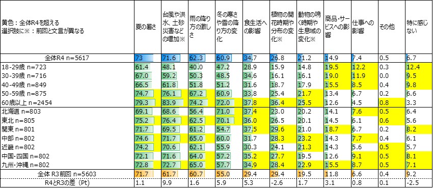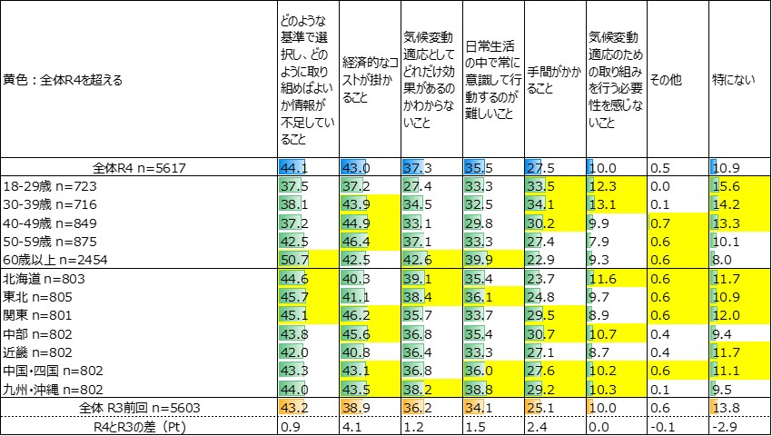 また、「経済的なコストが掛かること」は「東北」以外のすべての地域で昨年よりも2ポイント以上増加しました。気候変動が実際の生活に及ぼす災害等についての危険認識は高まっているものの、それらに対する気候変動適応の実践活動については、むしろ課題が強まる結果になっているのかもしれません。