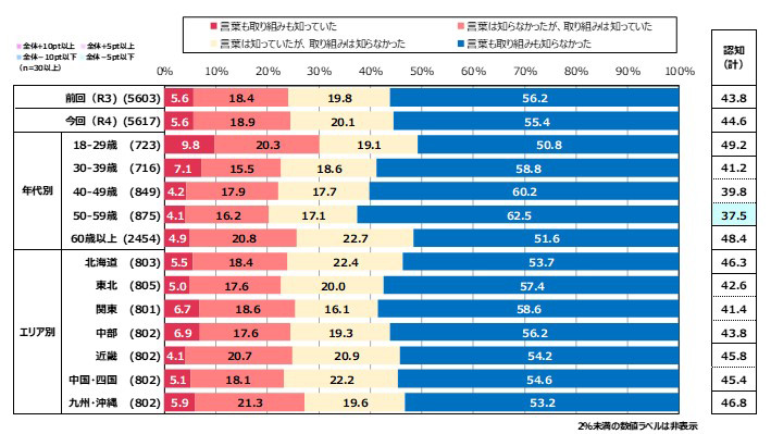 気候変動適応の認知は「言葉も取り組みも知っていた」5.6%、「言葉は知らなかったが、取り組みは知っていた」18.9%、「言葉は知っていたが、取り組みは知らなかった」20.1%という結果となりました。