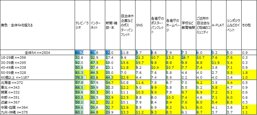 また、気候変動適応の認知経路は「テレビ/ラジオ」が最も多く60.7%、次いで「インターネット」(41.8%)、「新聞・雑誌・本」(32.0%)と続きます。60歳以上は「テレビ/ラジオ」と回答した方が76.5%と全体よりも10ポイント以上高い結果となりました。