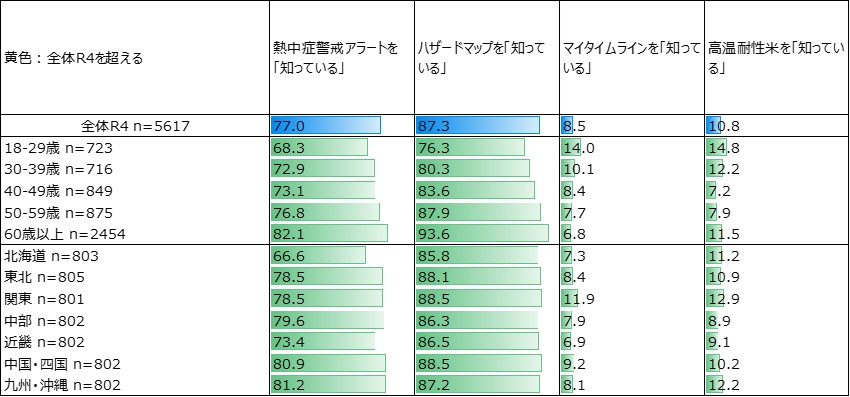 気候変動適応の商品やサービスについてそれぞれ知っているかをお聞きしました。その結果、「知っている」と回答した方が最も多いのは「ハザードマップ」となり87.3%の方が「知っている」と回答しました。「熱中症警戒アラート」に関しても7割以上の方が「知っている」と回答したのに対し、「マイ・タイムライン」「高温耐性米」の取り組みについては認知が低い結果となりました。