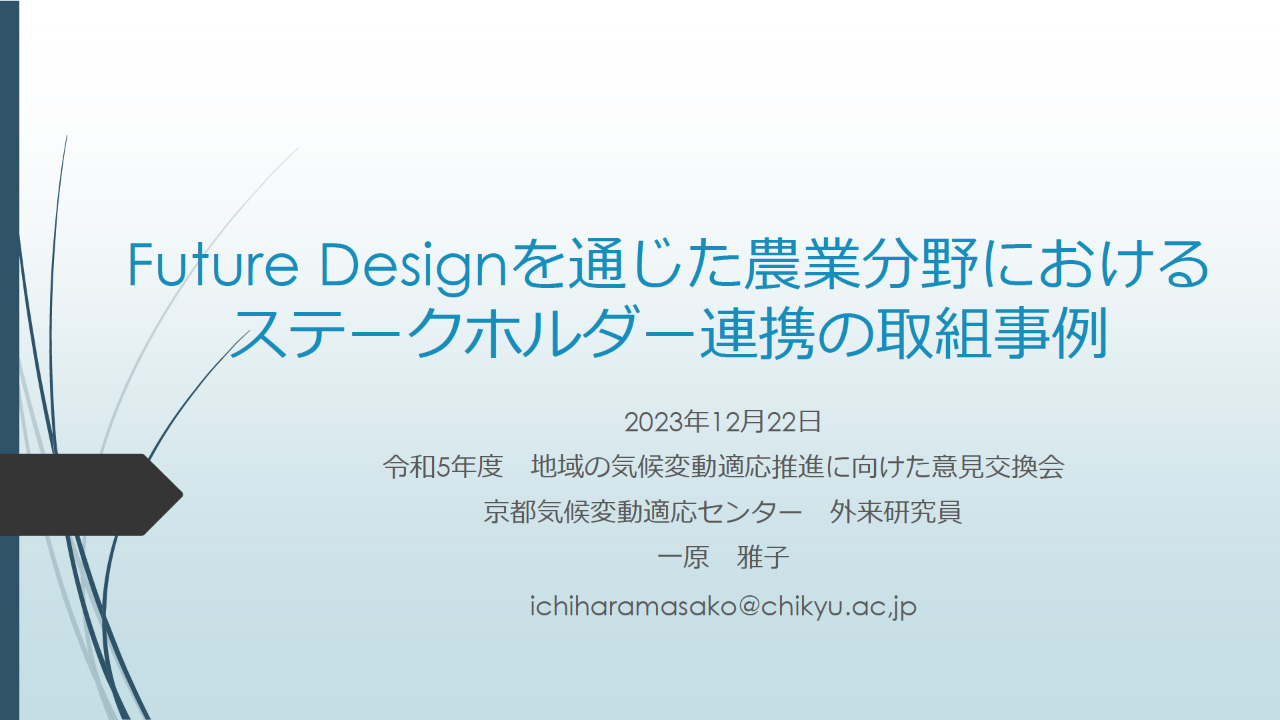 「将来人の立場で社会をデザインする」Future Designの企画から実現に至るまでの経緯について説明がありました。「気候変動下の京都の農業」について、産・官・学が視点の違いを前提としつつも対等に情報や知見を共有し、将来ヴィジョンを考える討議を実施。現在の制約から自由になれるFuture Designの仕組みは、専門的知見を率直に伝え合う場として有効であること、根本的かつ包括的な適応策の策定に活用し得ることが示唆されました。(発表者:京都気候変動適応センター 一原 雅子 外来研究員)
