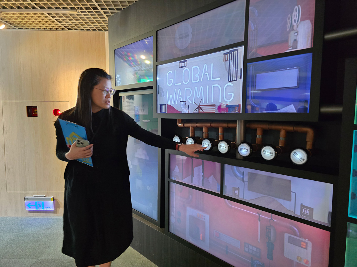 台湾南部に移動し、高雄市内にある国立科学工芸博物館を訪問しました。館内には気候変動に関する常設展があります。デジタルツールや体験型のコンテンツが充実し、子どもから大人まで幅広い世代が楽しく気候変動を学ぶための空間になっています。気候変動影響や適応をわかりやすく伝えるため、最新の知見を親しみやすい言葉、デザインに置き換えて掲示内容を工夫しているようです。実際に台湾の各都市で取り組まれる適応策事例や、乳牛・畜舎における暑熱対策の掲示物や、新たに子ども向けに制作している展示物についても共有いただきました。