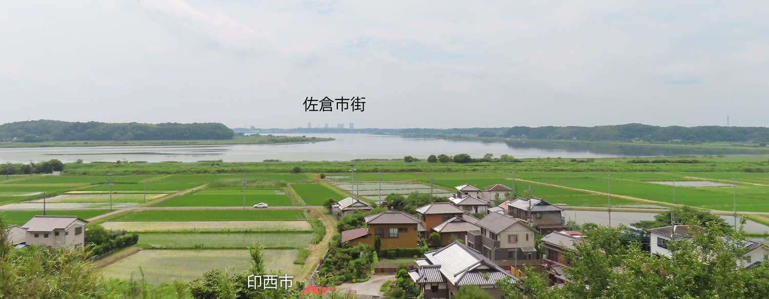 印西市側から佐倉市側を望める高台に上がり、西印旛沼を一望しました。印旛沼周辺の低地(田畑)とその周辺に広がる台地の地形が確認できました。また雨水を溜める台地と、そこから水が流れ込む印旛沼、その下流の市街地という流域としての営みを学ぶことができました。