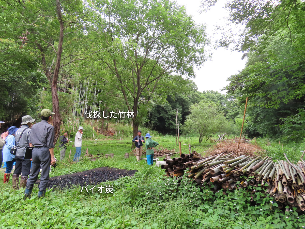 谷田・武西の谷津は、以前は湧水を活かした稲作が行われていましたが、その後耕作が行われない状況になっていました。市有地となった後、企業(MS&AD インシュアランス グループ)の職員の方々や市民団体(NPO法人谷田武西の原っぱと森の会、里山グリーンインフラネットワークなど)、印西市、白井市、国立環境研究所などにより、谷津の湿地環境の再生・保全が行われており、その現場を視察しました。また台地上の草原整備、伐採した竹のバイオ炭づくり等の活動もおこなわれています。MS&ADインシュアランス グループ職員の方々の活動の様子は、以下インスタグラムからも発信されています。