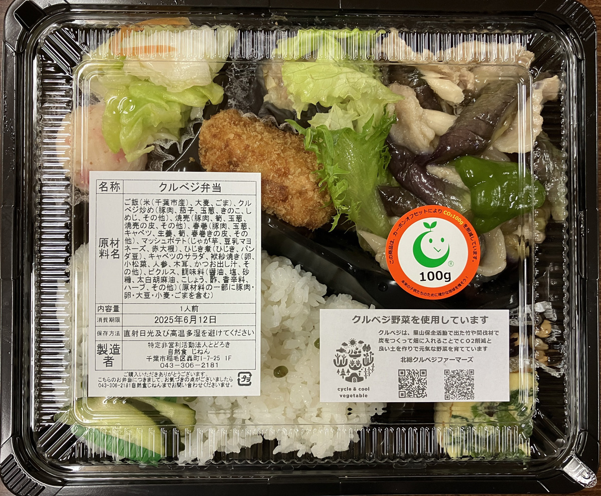 2020年11月から清水建設、富里市、NPO(富里のホタル、アースウオッチ・ジャパン)、市民団体(おしどりの里を育む会)、研究機関(国立環境研究所など)などの連携により、再生が行われている「八ツ堀のしみず谷津」も視察しました。「リビングラボ」のアプローチを採用しており、地域内外の方々が参加できる自然体験の場の提供(田植え、秘密基地づくり等)など、多様な主体と様々な取組みを進めています。また伐採した竹をバイオ炭にし、土壌改良剤として農地に漉き込むこと で、脱炭素と地域内の資源循環にも活用されています。またその農地で作られた野菜(クルベジ)を使ったお弁当も販売されています(右写真)。これらの取組みは、第4回グリーンインフラ大賞(グリーンインフラ官民連携プラットフォーム主催)において国土交通大臣賞を受賞しました。