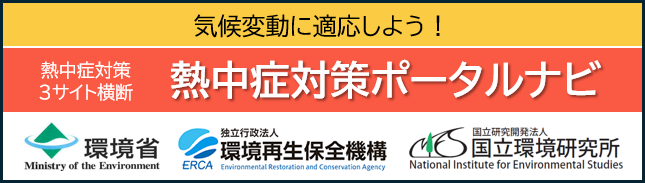 「熱中症対策ポータルナビ」は 環境省/環境再生保全機構/国立環境研究所 の3機関がそれぞれ運用する熱中症対策に関する3つのサイト内のコンテンツを総合的に整理したうえ作成しました。
