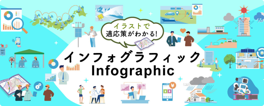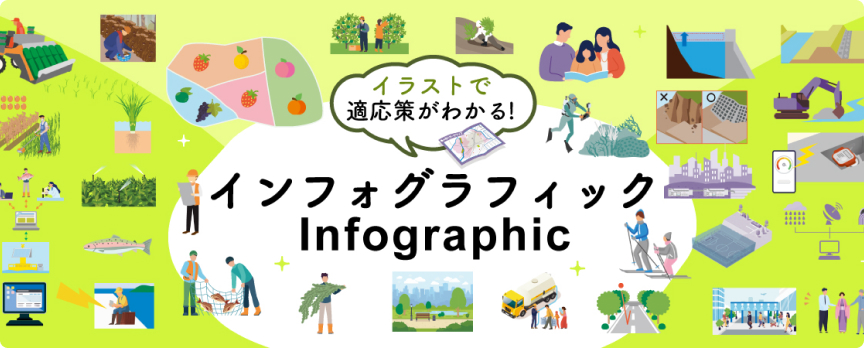気候変動の影響や適応策が分かるよう、「影響の要因⇒現在の状況と将来予測⇒適応策」の関係性を示し、イラストとともに分かりやすく作成し掲載しています。